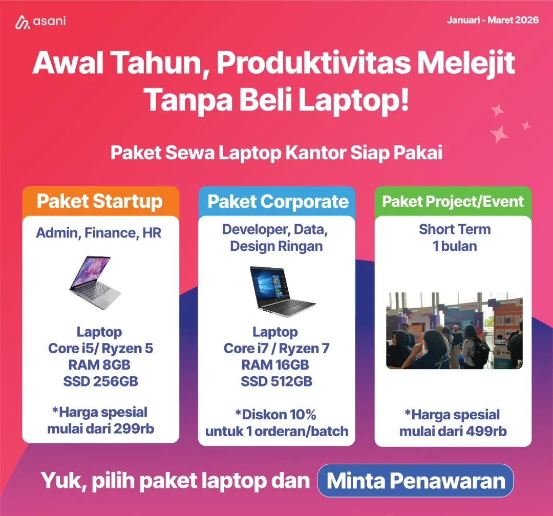 Tentunya, Anda tidak ingin ini terjadi, bukan? Jangan biarkan hal ini mengganggu operasional harian perusahaan. Salah satu solusinya adalah dengan menyewa laptop-laptop dan perangkat jaringan terbaik di Asani. Dengan begitu, produktivitas karyawan di kantor tak lagi terhambat oleh device yang bermasalah.