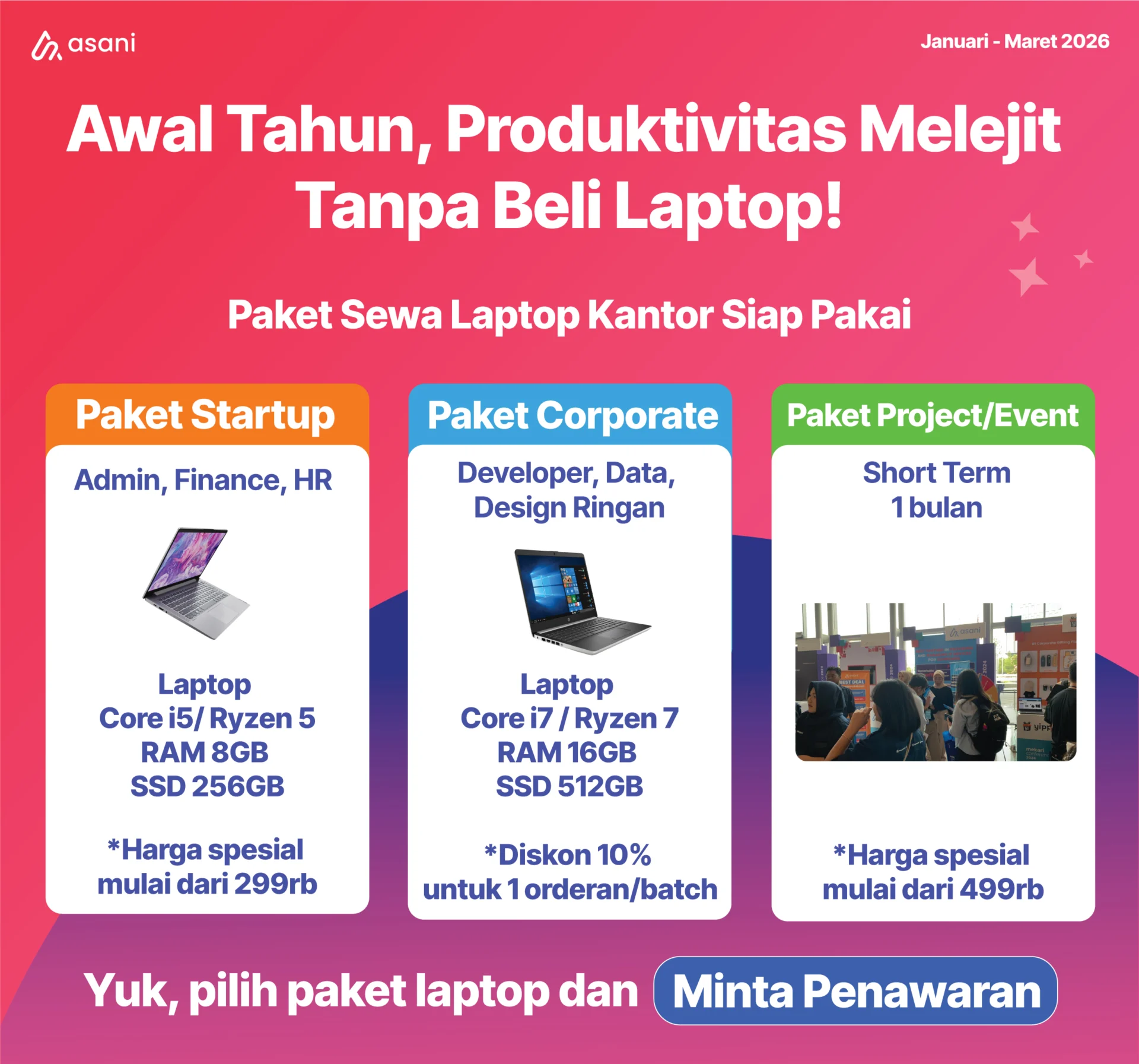 Asani merupakan partner yang tepat untuk Anda jika membutuhkan penyewaan laptop dan perangkat IT untuk perusahaan. Jika Anda tertarik, ajukan penawaran sekarang juga ke Asani.