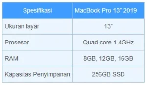 - MacBook Pro: ukuran layar mulai dari 13″, 15″ dan 17″. Laptop ini cocok untuk pekerja professional di bidang grafis, video, atau programming.