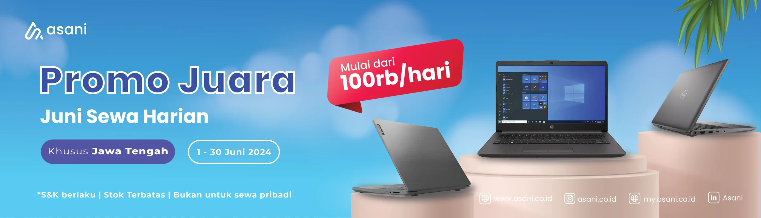 Asani menyediakan sewa laptop harian untuk kebutuhan event atau keperluan bisnis dalam jangka waktu singkat. Harga sewa mulai dari Rp100.000/hari.